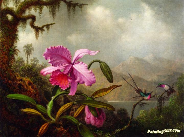 Orchids and Hummingbirds near a Mountain Lake, Art Painting by Martin Johnson Heade