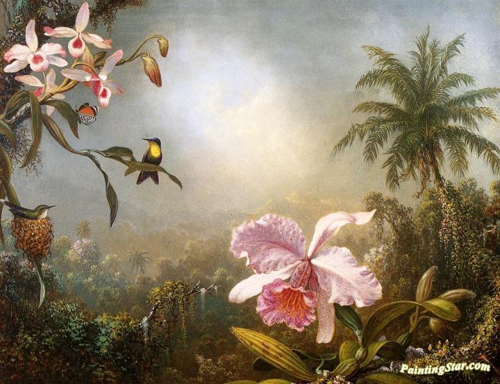 Orchids, Nesting Hummingbirds And A Butterfly, Art Painting by Martin Johnson Heade