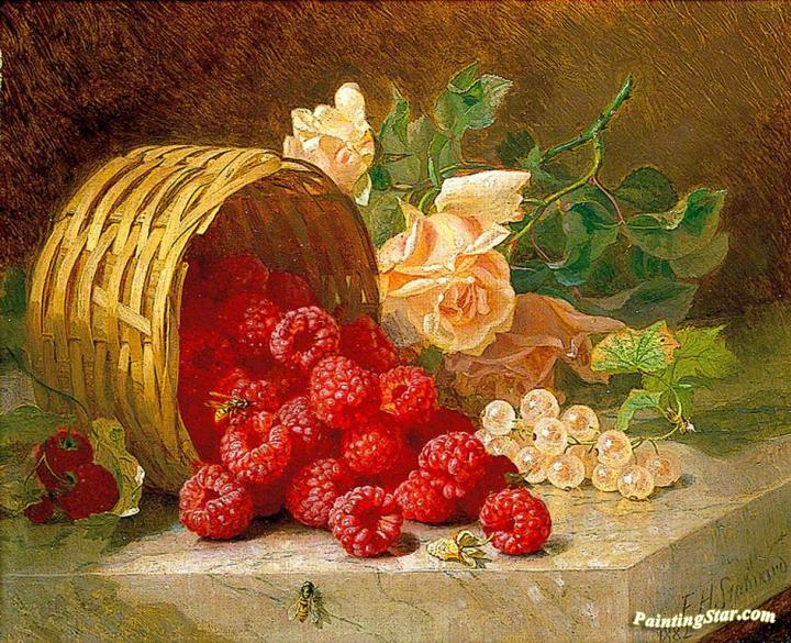 Overturned Basket with Raspberries, White Currants and Roses, Art Painting by Eloise Harriet Stannard