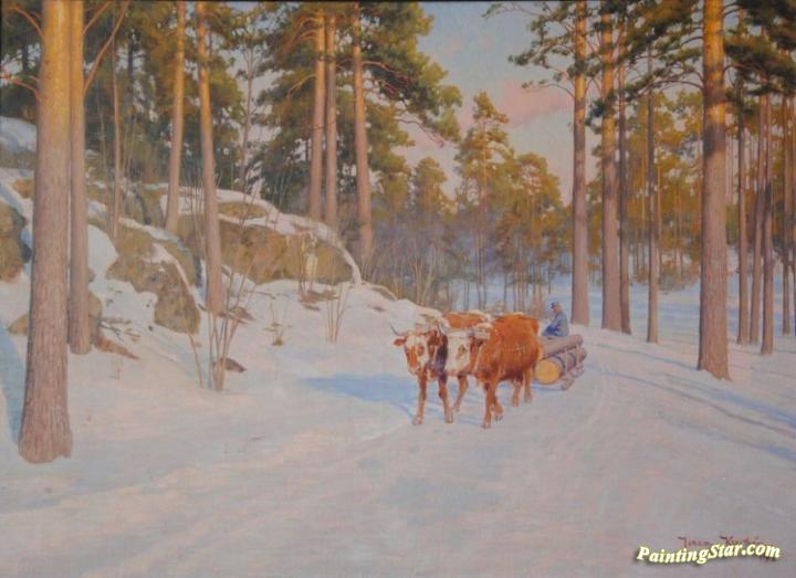 Oxen in winter landscape, Art Painting by Johan Krouthén