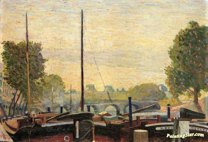 Paris, The Seine, the Barges of the Louvre, Art Painting by Gino Severini