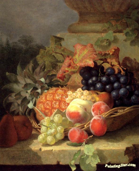 Peaches, Grapes And A Pineapple In A Basket, On A Stone Ledge, Art Painting by Eloise Harriet Stannard