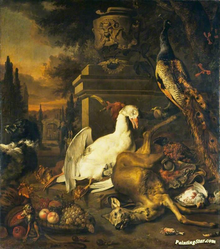 Peacock, Dead Game And Monkey, Art Painting by Jan Weenix