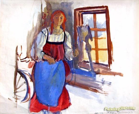 Peasant woman at spinning-wheel, Art Painting by Zinaida Serebriakova