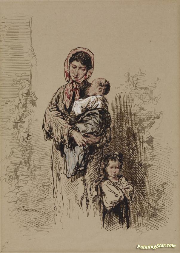 Peasant Woman With Two Young Children, Art Painting by Paul Gavarni