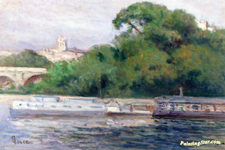 Pèniches Amarées devant Bouquet d'Arbres et Pont, Art Painting by Maximilien Luce