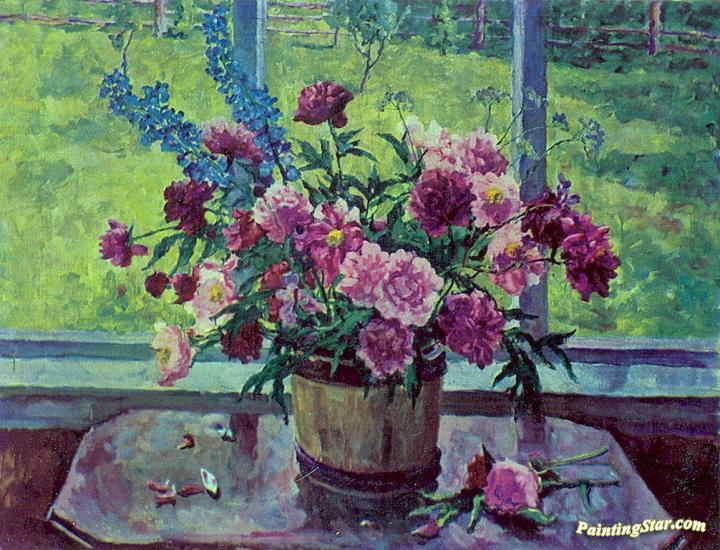 Peonies at the window, Art Painting by Pyotr Konchalovsky