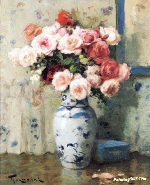 Pink Roses And A Blue Snuff Box, Art Painting by Fernand Toussaint