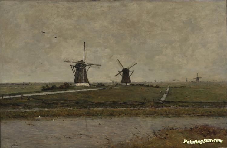 Polder with Mills near Overschie, Art Painting by Paul Joseph Gabriel