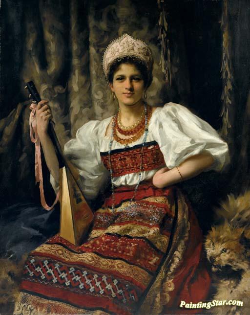 Portrait Of Anne In Russian Costume Holding A Balalaika, Art Painting by Thomas Benjamin Kennington