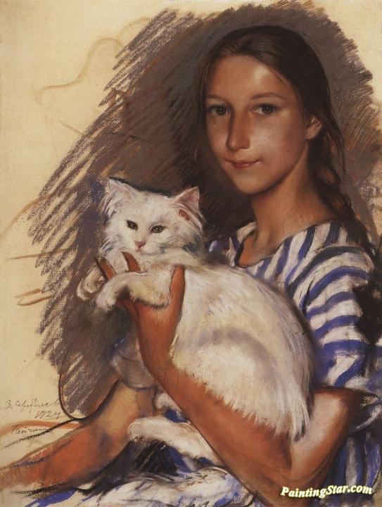 Portrait of Natasha Lancere with a Cat, Art Painting by Zinaida Serebriakova