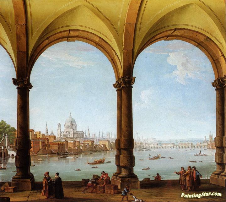 Prospect of London from a collonade with a distant view of St. Paul's and Old London Bridge, Art Painting by Antonio Joli