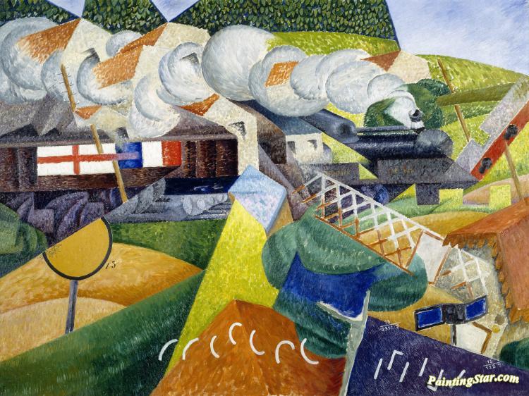 Red Cross Train Passing A Village (train De La Croix Rouge Traversant Un Village),1915, Art Painting by Gino Severini