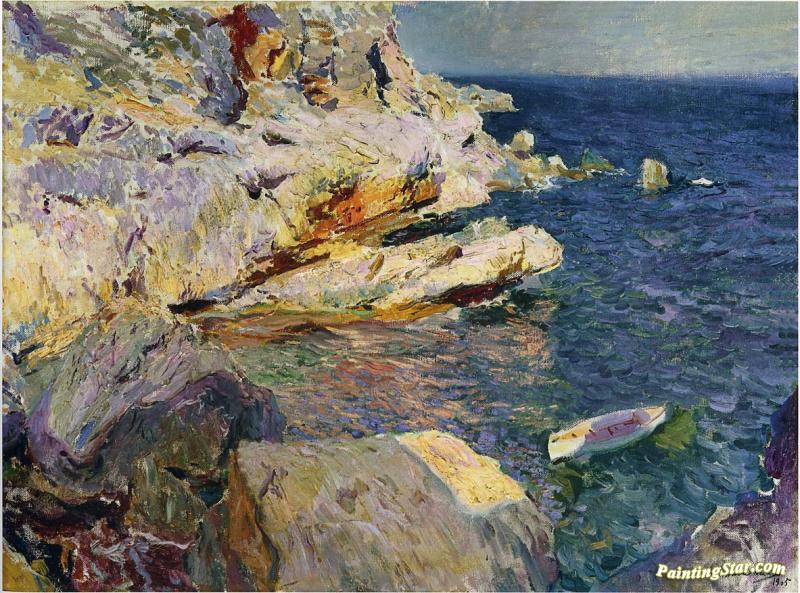 Rocks And White Boat, Javea, Art Painting by Joaquin Sorolla y Bastida