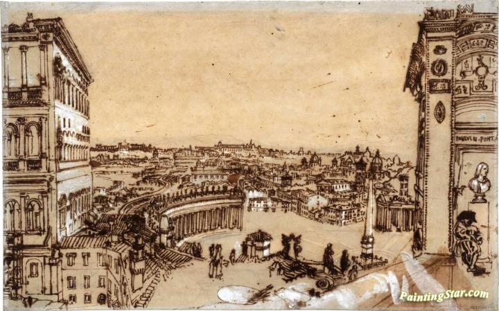 Rome, View of St Peter's Square, from the Loggia of the Vatican - Study for 'Rome from the Vatican', Art Painting by Joseph Mallord William Turner