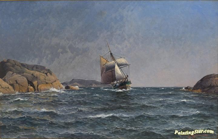 Sailing ship at the rocky coast, Art Painting by Lauritz Haaland