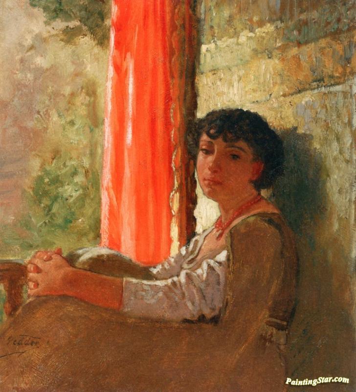 Seated Girl With A Red Curtain, Art Painting by Elihu Vedder