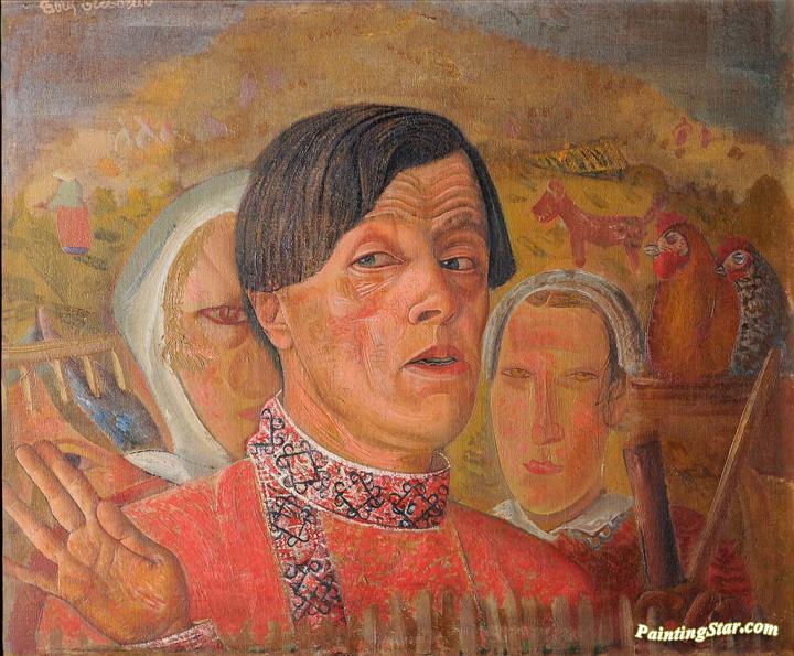 Self-portrait With Rooster And Hen, Art Painting by Boris Grigoriev