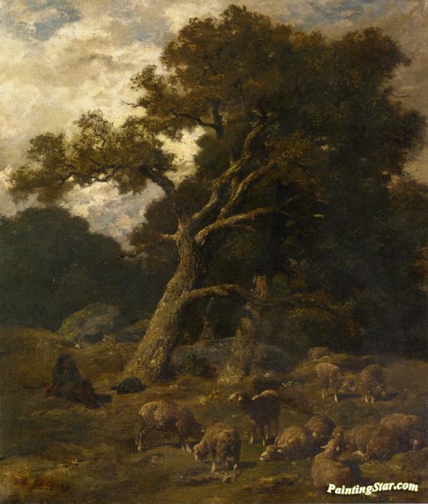 Shepherd and his Sheep in Fontaineblelau Forest, Art Painting by Charles-Émile Jacque
