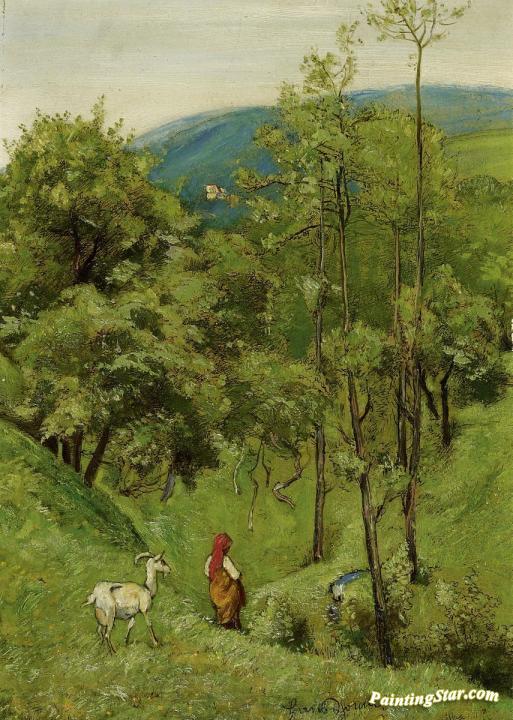 Shepherd Girl With A Goat In The Meadow Of Rolling Hills, Art Painting by Hans Thoma