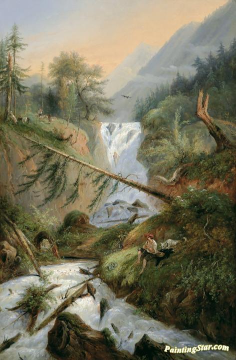 Shepherd Resting by the Waterfall, Art Painting by Alexandre Calame