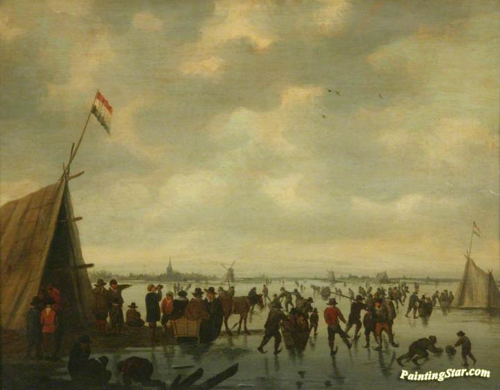 Skating Scene with a Tent and Numerous Figures on a Wide River, Art Painting by Egbert van der Poel