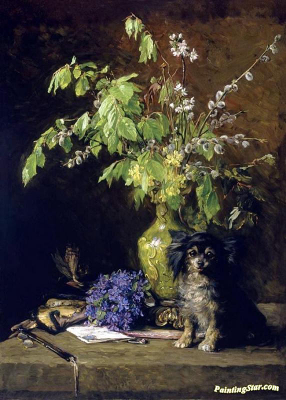 Spring Bouquet With Dog, Art Painting by Bertha Wegmann