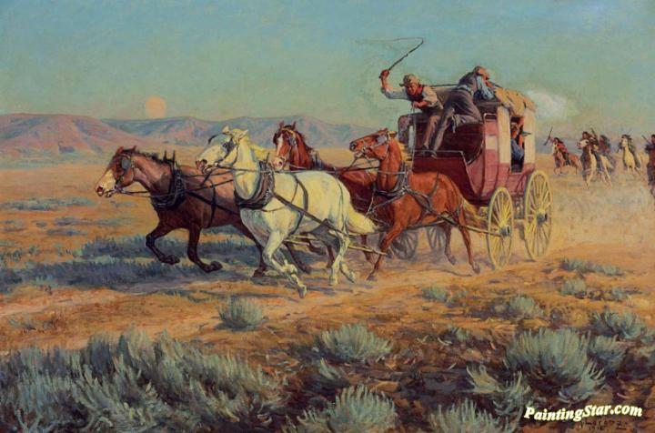 Stagecoach Pursued By Mounted Indians, Art Painting by Richard Lorenz