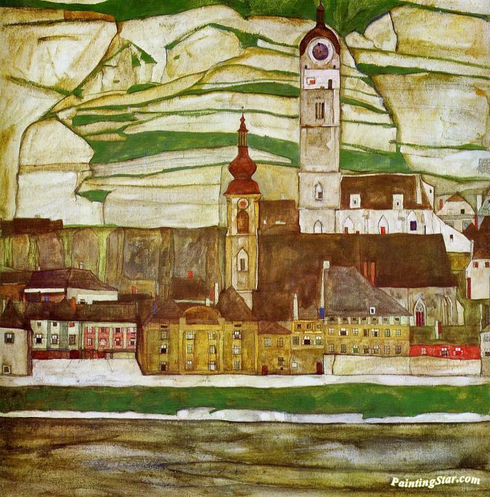 Stein on the Danube with Terraced Vineyards, Art Painting by Egon Schiele