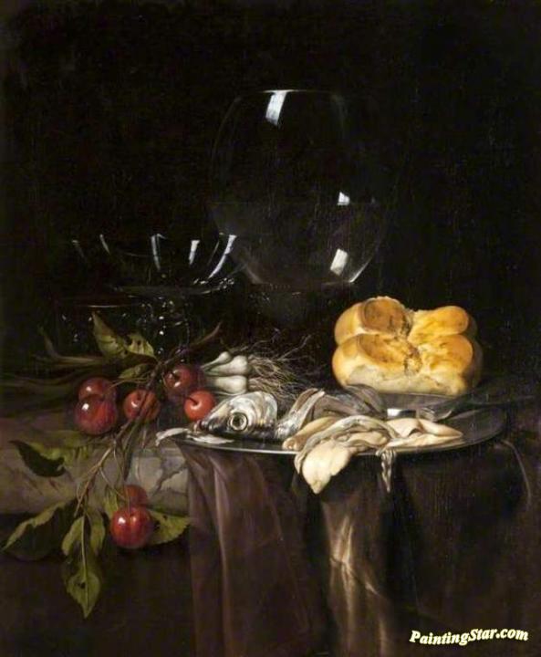 Still Life, Herring, Cherries and Glassware, Art Painting by Willem van Aelst