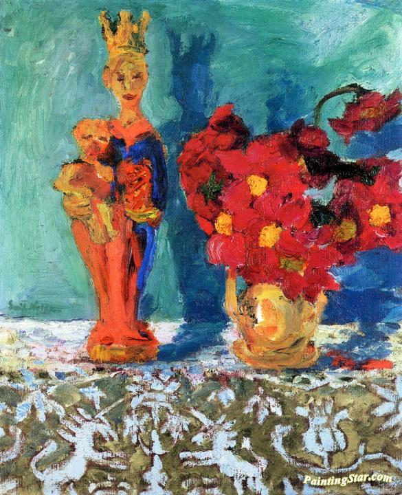 Still Life Of Ponpon Dahlias And A Madonna Figurine, Art Painting by Emil Nolde