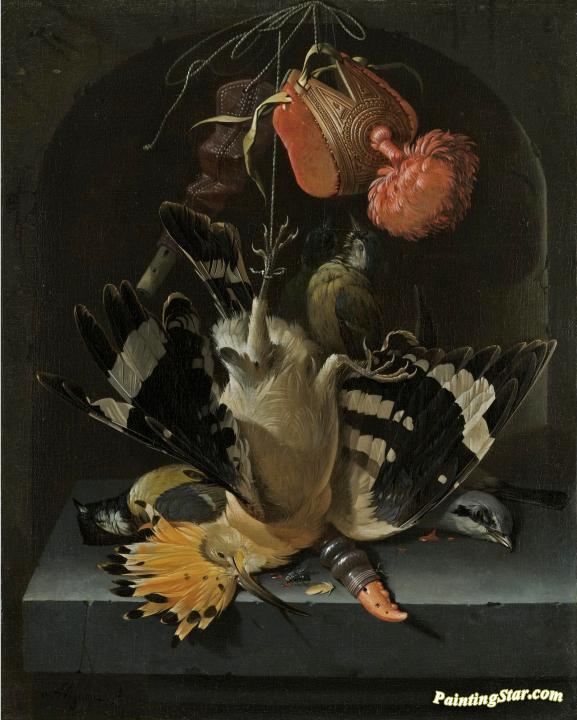 Still life with a hoopoe, a great tit, a falconry hood and a decoy whistle, Art Painting by Abraham Mignon