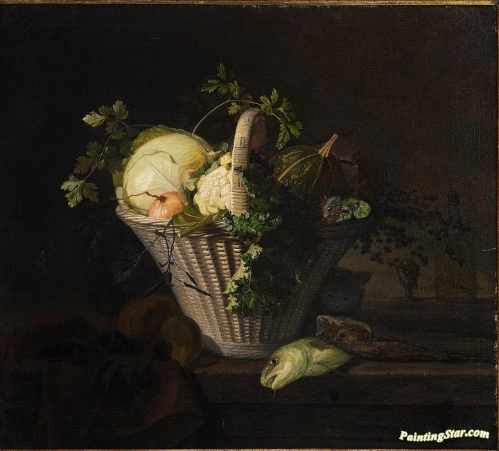 Still Life with Basket of Vegetables and Fish, Art Painting by Frants Boe