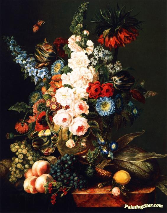 Still Life with Flowers, Fruit and Corn, Art Painting by Cornelius Krieghoff