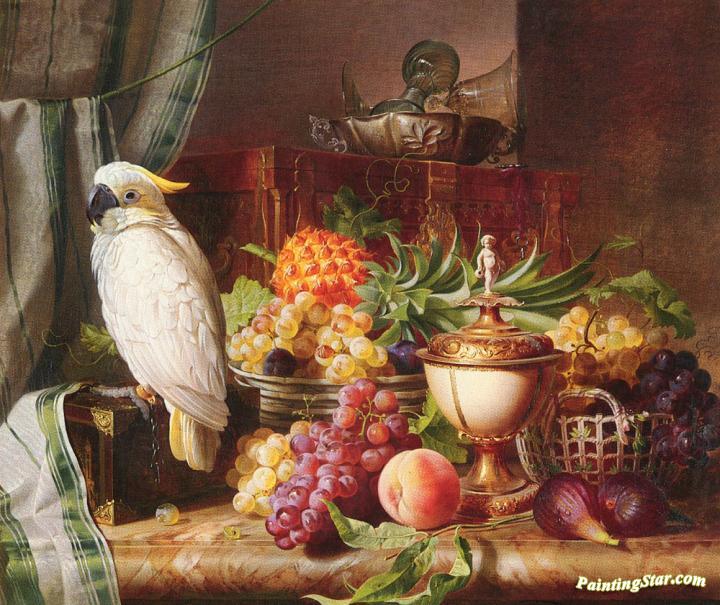 Still Life with Fruit and a Cockatoo, Art Painting by Joseph Schuster