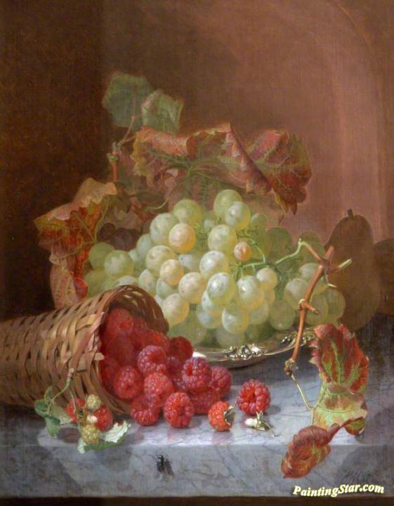 Still Life with Grapes and with Raspberries Spilling out of a Basket, Art Painting by Eloise Harriet Stannard