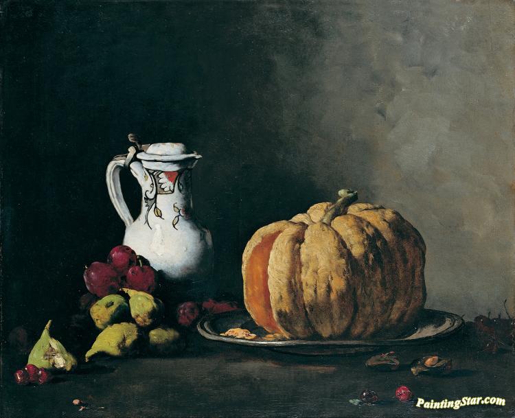 Still Life With Pumpkin,plums,cherries,figs And Jug, Art Painting by Theodule Ribot