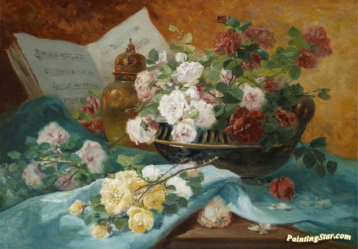 Still life with roses, vase and music book, Art Painting by Eugene Henri Cauchois