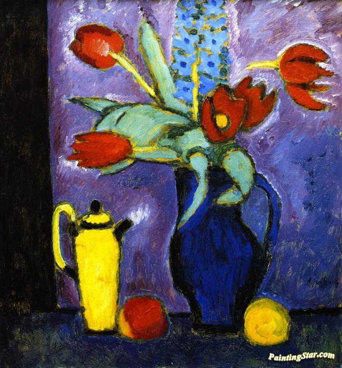 Still Life with Tulips, Blue Jug, Yellow Coffee Pot, Art Painting by Alexej Jawlensky