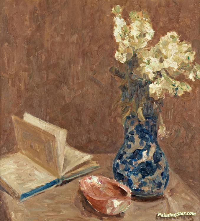Stilleben Med Bok Och Blomster, Art Painting by Oskar Moll