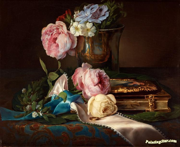Stilleben Med Rosor, FÖrlovningsring Och Silverpokal, Art Painting by Henriette Kaergling-pacher