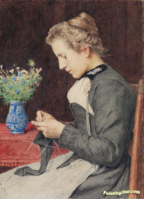 Strickende junge Frau mit Blumenstrauss, Art Painting by Albert Anker