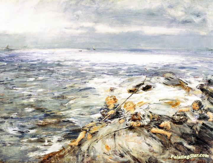 Sun on the Waters, Fishing from the Rocks at Carradale, Art Painting by William Mctaggart
