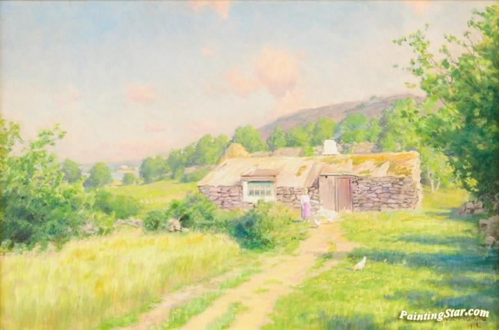 Sunlit summer landscape with girl and chickens, Art Painting by Johan Krouthén