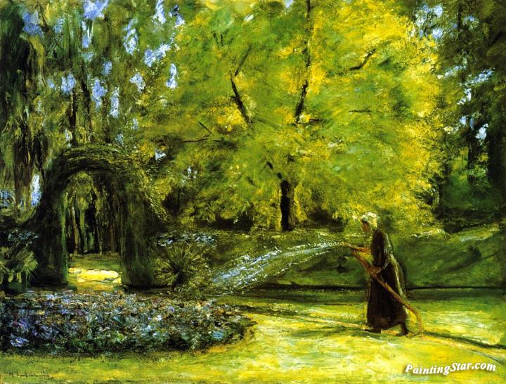 The Circular Bed in the Hedge Garden with a Woman Watering flowers, Art Painting by Max Liebermann