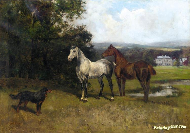 The Colonel's Horses And Collie With Huntroyde Hall Beyond, Art Painting by Henry John Yeend King