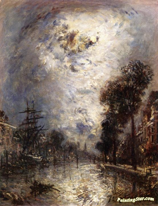 The Interior of the Port at Rotterdam, Effect of Moonlight, Art Painting by Johan Berthold Jongkind