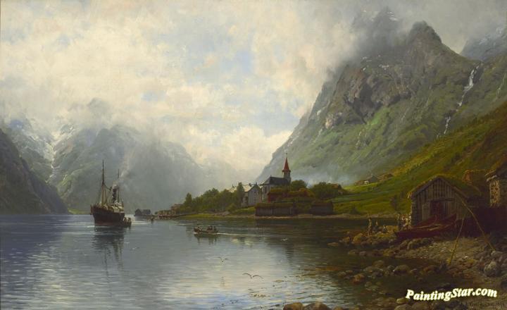 The steamer in Nærøyfjord, Art Painting by Anders Monsen Askevold