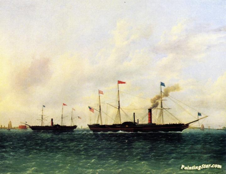 The U.S. Mail Steamship "Washington" Flying the Mail Flag Passing the "Hermann" off Governors Island, Art Painting by James E. Buttersworth
