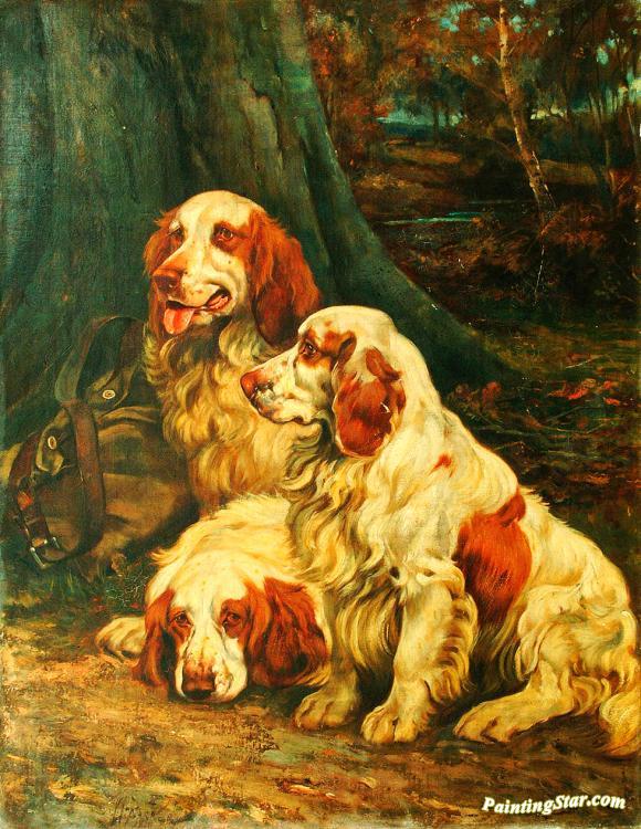 Three Clumber Spaniels Resting In A Woodland Landscape, Art Painting by Wright Barker